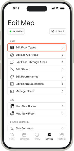 If Matic has incorrectly detected your floor types, you can correct them. To ensure Matic mops only hard floors and does not miss any areas, make sure the floor types on your map are labeled correctly.